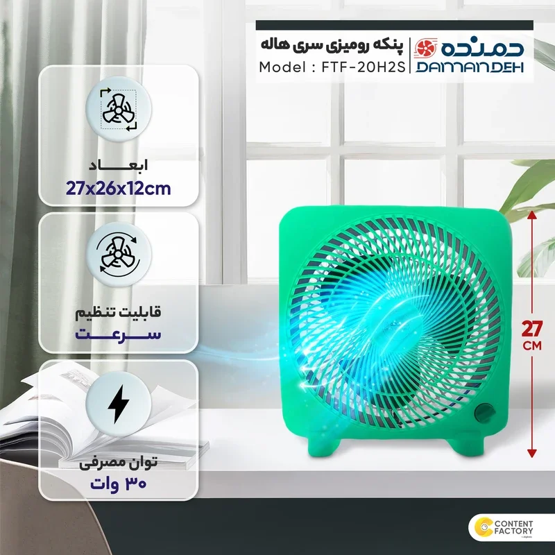 پنکه رومیزی دمنده سری هاله مدل FTF-20H2S محصولی ساده و جمع و جور با قابلیت تنظیم سرعت در سه حالت مختلف است که در دور تند سرعت گردش پروانههای آن به 2200 دور در دقیقه هم میرسد. این پنکهی رومیزی جزو گزینههای خوش ساخت و واقعا کم صدای بازار است که میتوان از آن بر روی میز کار استفاده کرد. جالب است بدانید که پنکهی برقی مجهز به سیستم خودکار محافظت در برابر حرارت (ترموگارد) است و در صورت افزایش دمای موتور به هر دلیلی، به صورت اتوماتیک خاموش میشود. البته این کالای سرمایشی دارای کنترل از راه دور و تایمر نیست. وزن پنکه رومیزی دمنده سری هاله مدل FTF-20H2S حدودا 1.4 کیلوگرم و حجم باددهی آن 350 متر مکعب بر دقیقه است.